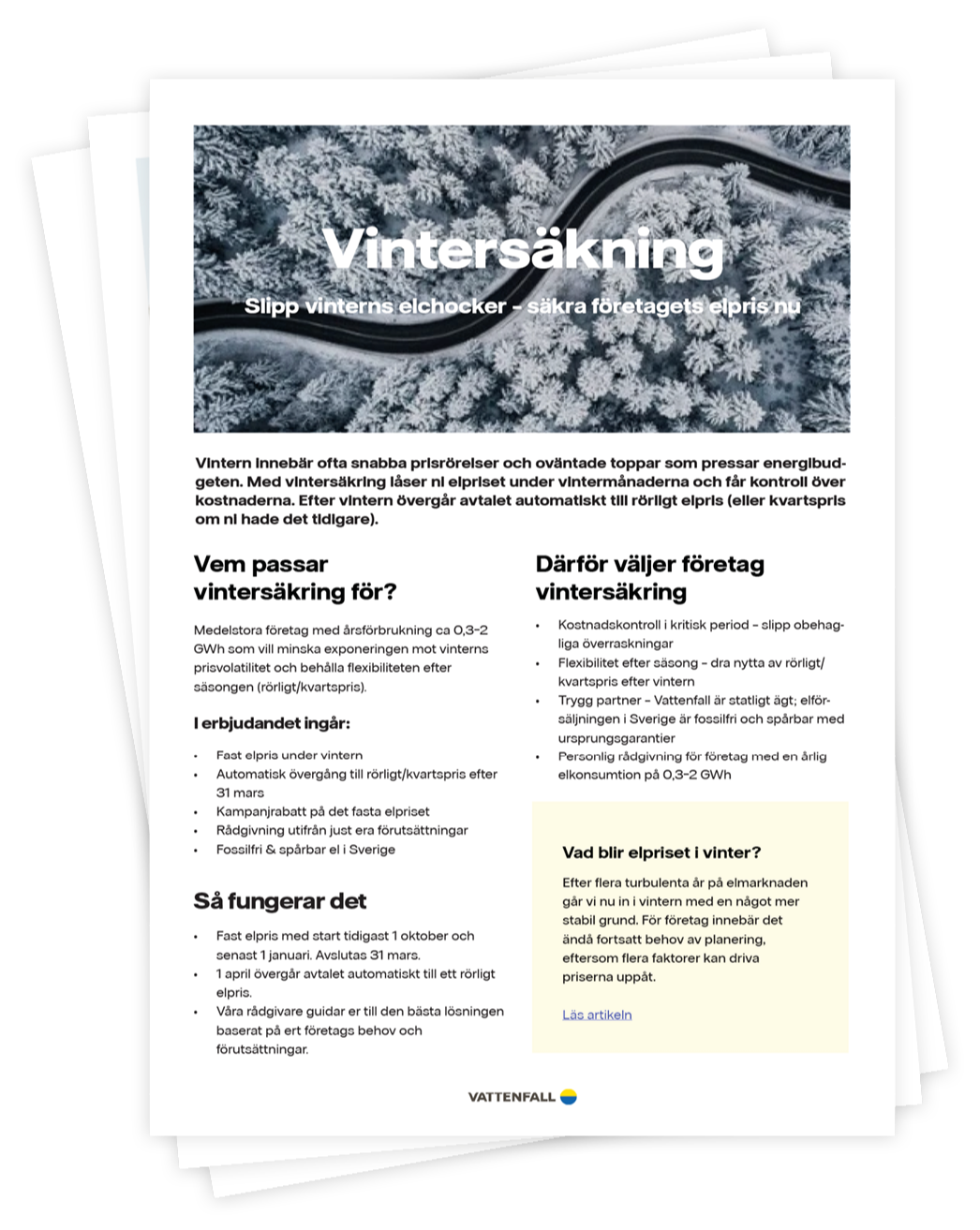 Vintern innebär ofta snabba prisrörelser och oväntade toppar som pressar energibudgeten. Med vintersäkring låser ni elpriset under vintermånaderna och får kontroll över kostnaderna. Efter vintern övergår avtalet automatiskt till rörligt elpris (eller kvartspris om ni hade det tidigare).